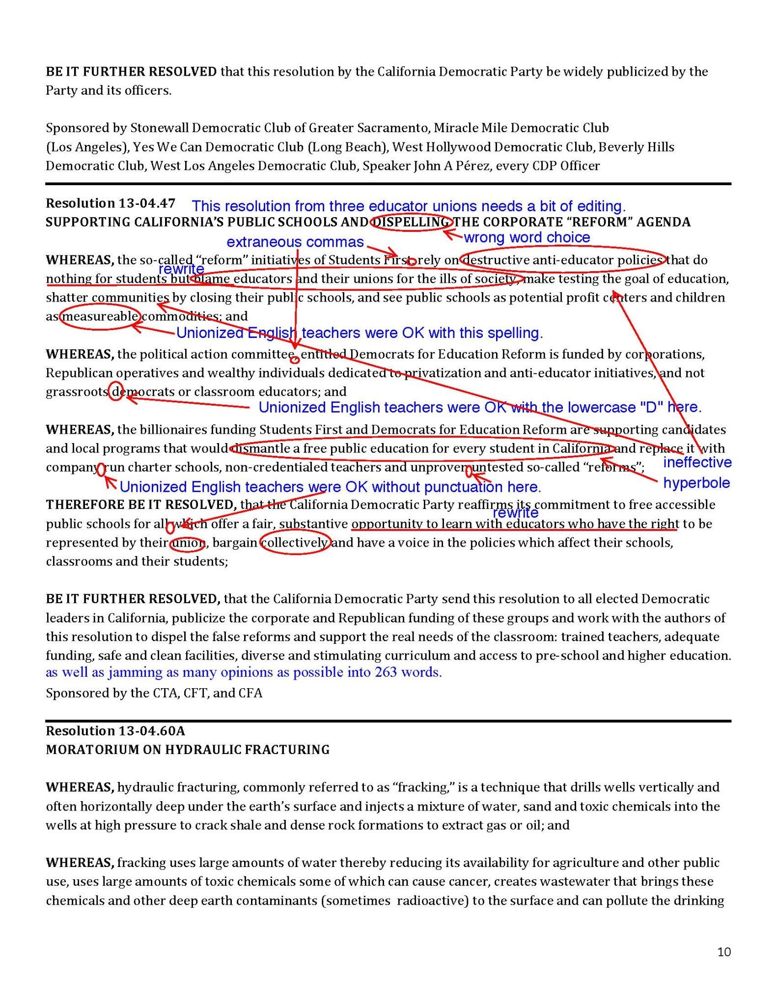 Three teachers unions were reportedly involved in the presentation and final drafting of this resolution. The Democratic Party claims to champion education, yet in a poorly worded and edited resolution against Republican corporate privatization of public education, California Democratic Party leaders established that they are more interested in protecting labor unions than providing a quality education for all California kids, or even expecting a minimal standard of communication fro party leaders.